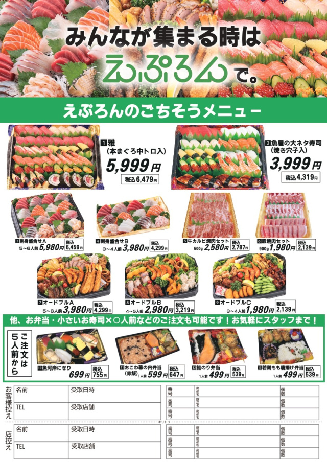 定番の大皿寿司、オードブルから、旬のお刺身盛り合わせや、焼肉セットもあります!