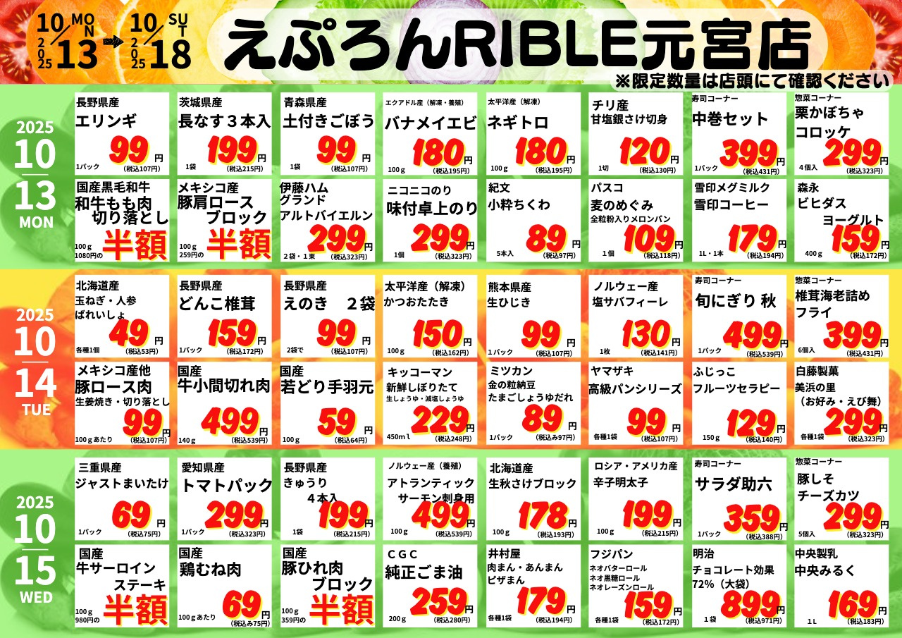 チラシ売出期間 | 2025年10月13日(2025-10-13) 〜 2025年10月18日(2025-10-18) |