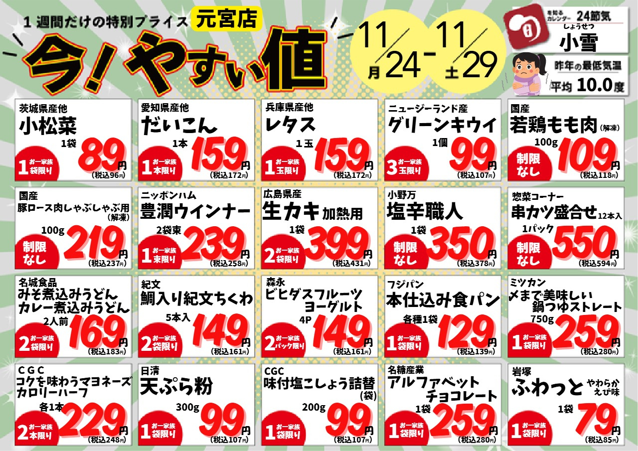 | チラシ売出期間 | 2025年11月24日(2025-11-24) 〜 2025年11月29日(2025-11-29) |