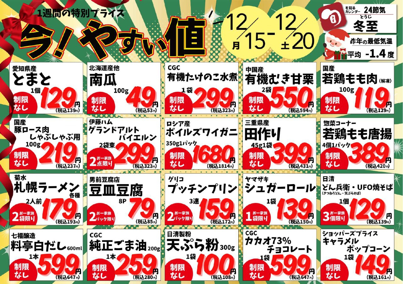 | チラシ売出期間 | 2025年12月15日(2025-12-15) 〜 2025年12月20日(2025-12-20) |