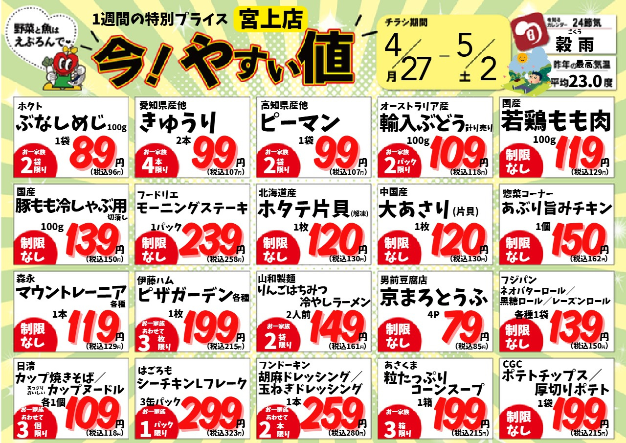 - チラシ掲載商品や特売商品は豊富に取り揃えておりますが、万一品切れの際はご容赦ください。また、チラシ掲載内容は、都合により変更になる場合や店舗によって異なる場合がございます。詳細は店頭にてご確認ください。
