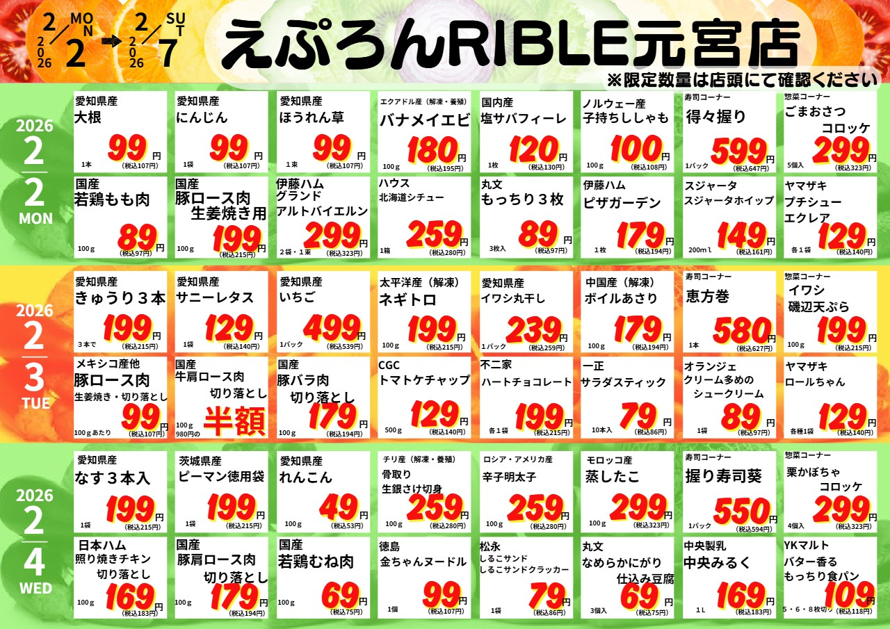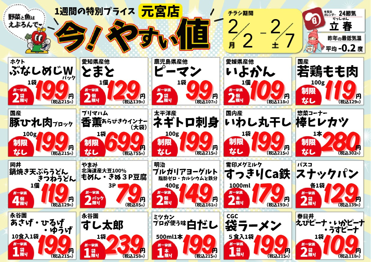 えぷろん生鮮館 リブレ元宮店 チラシ 2/2~7 元宮店の今!やすい値 売出期間: 2026/2/2(2026-02-02) 〜 2026/2/7(2026-02-07) 2/2~7 元宮店のお買い得 売出期間: 2026/2/2(2026-02-02) 〜 2026/2/7(2026-02-07) 1/26~31 元宮店の今!やすい値 売出期間: 2026/1/26(2026-01-26) 〜 2026/1/31(2026-01-31) \ 今月のおすすめ品♪ / おすすめ品を見る 営業時間 (月~土)9:30~20:00 (日)9:30~19:00 ※リブレ元宮店のみ日曜日も営業 定休日 8/14~15、1/1~4 住所 〒471-0871豊田市元宮町2-11 リブレ豊田元宮1F 電話番号 0565-37-8833 FAX 0565-37-8834 ご意見・お問い合わせ