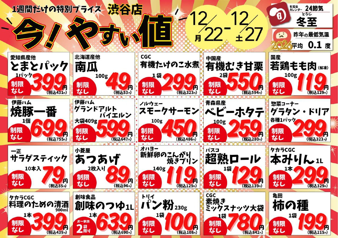 えぷろん渋谷店 チラシ 12/22~27 全店共通チラシ 売出期間: 2025/12/22(2025-12-22) 〜 2025/12/27(2025-12-27) 12/22~27 渋谷店の今!やすい値 売出期間: 2025/12/22(2025-12-22) 〜 2025/12/27(2025-12-27) (予約専用)2025年末のごちそうメニュー! 売出期間: 2025/11/17(2025-11-17) 〜 2025/12/31(2025-12-31) \ 今月のおすすめ品♪ / おすすめ品を見る 営業時間 (月~金)9:00~20:00 (土)9:00~19:00 定休日 日曜日、8/14~15、1/1~4 住所 〒471-0808豊田市渋谷町3-37-15 電話番号 0565-88-1616 FAX 0565-88-1617 ご意見・お問い合わせ 渋谷店では「えぷろん宅配ネット便」もご利用いただけます。 「えぷろん宅配ネット便」の詳細情報はこちら
